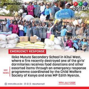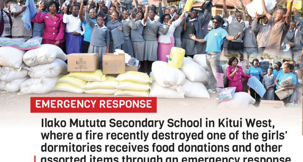 Donations Towards Ilako Mutu Secondary school in Kitui West, where a fire recently destroyed one of the girls dormitories receives food donations and other assorted items through an Emergency Response Programme  coordinated by the Child Welfare Society of Kenya and area MP Edith Nyrnze.